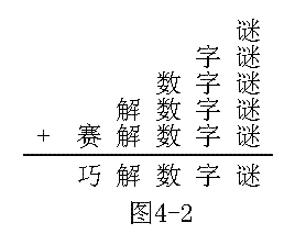 3、在图4-3所示的加法算式中,相同的汉字表示相同的数字,不同的汉字表示不同的数字.请把这个竖式翻译成数字算式.