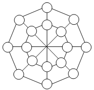 2、把1~16填入下图中,使每条边上4个数的和相等,两个八边形上8个数的和也相等.